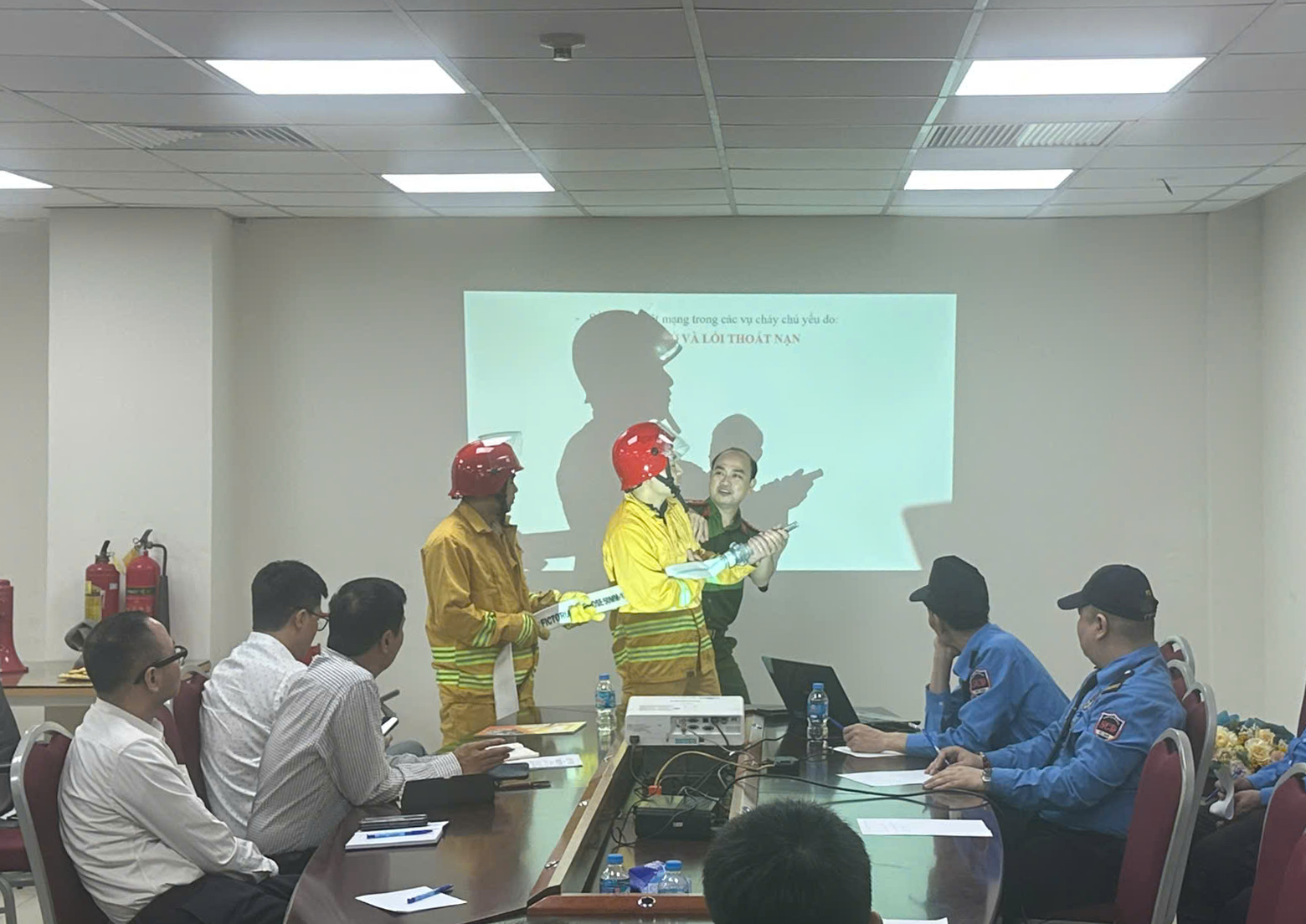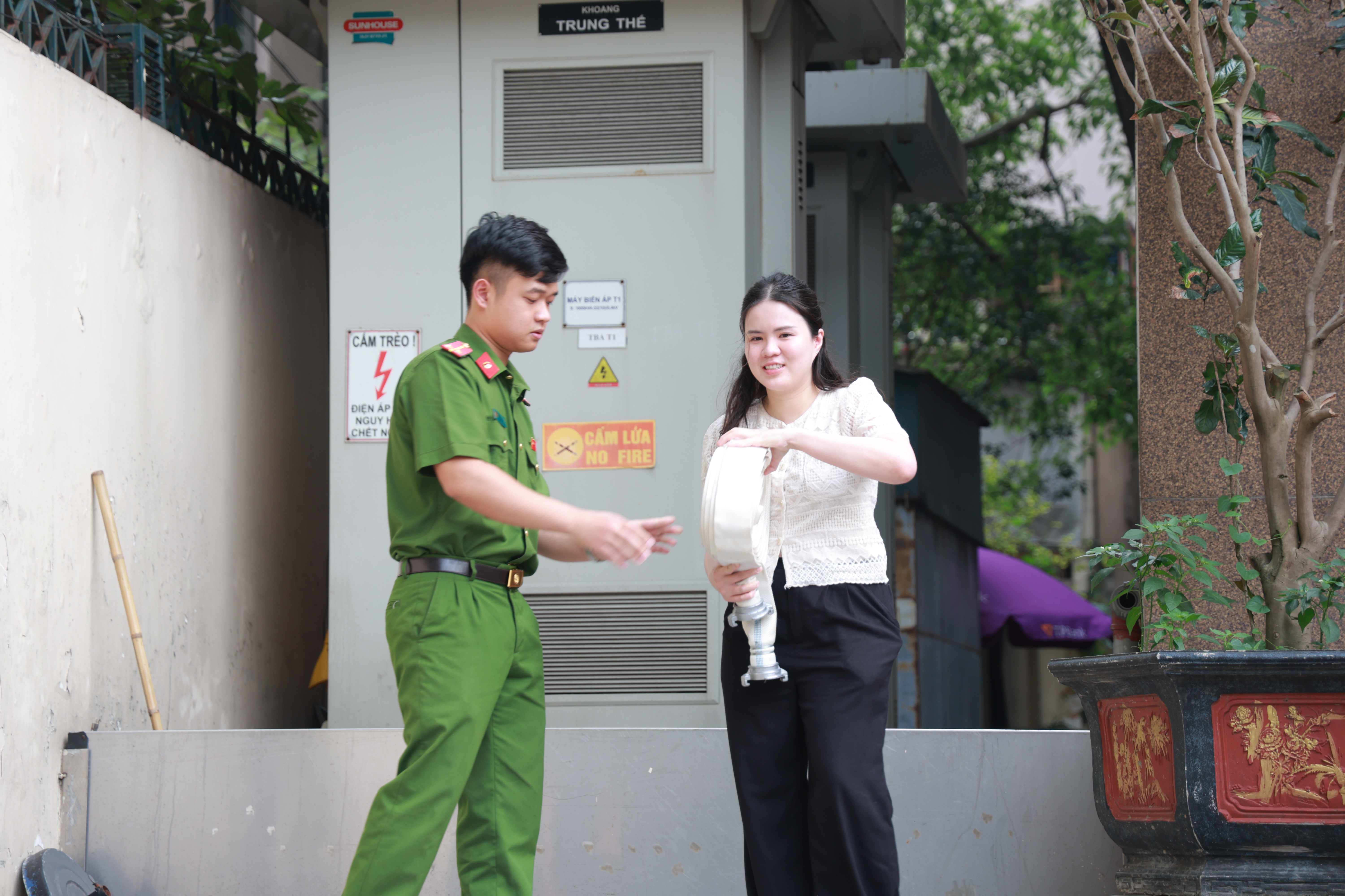 Đại úy Vương Văn Khôi - Giảng viên Trường Đại học Phòng cháy chữa cháy đã phổ biến tình hình cháy nổ trên cả nước và trên địa bàn Hà Nội; đồng thời giới thiệu các văn bản quy phạm pháp luật, hướng dẫn về công tác PCCC&CNCH. Các cán bộ của hai đơn vị đã được hướng dẫn kỹ năng xử lý các tình huống cháy, nổ; cách báo cháy qua số điện thoại 114; sử dụng bình chữa cháy xách tay; vận hành hệ thống chữa cháy tại chỗ; tổ chức thoát nạn, bảo vệ tài sản và phối hợp với lực lượng Cảnh sát PCCC&CNCH.
