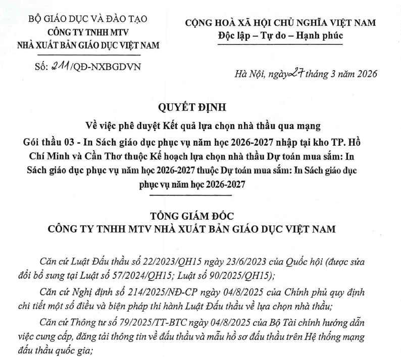 QĐ phê duyệt kết quả lựa chọn nhà thầu qua mạng Gói thầu 03 - In SGD phục vụ năm học 2026-2027 nhập kho TP. Hồ Chí Minh thuộc KH lựa chọn nhà thầu Dự toán mua sắm: In SGD phục vụ năm học 2026-2027 thuộc DTMS: In SGD phục vụ năm học 2026-2027