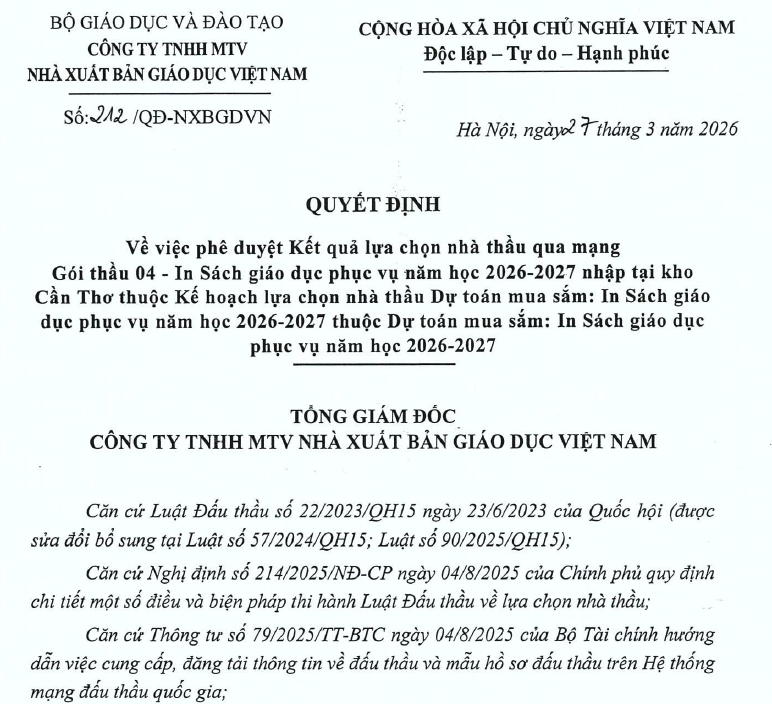 QĐ phê duyệt kết quả lựa chọn nhà thầu qua mạng Gói thầu 04 - In SGD phục vụ năm học 2026-2027 nhập kho Cần Thơ thuộc KH lựa chọn nhà thầu Dự toán mua sắm: In SGD phục vụ năm học 2026-2027 thuộc DTMS: In SGD phục vụ năm học 2026-2027