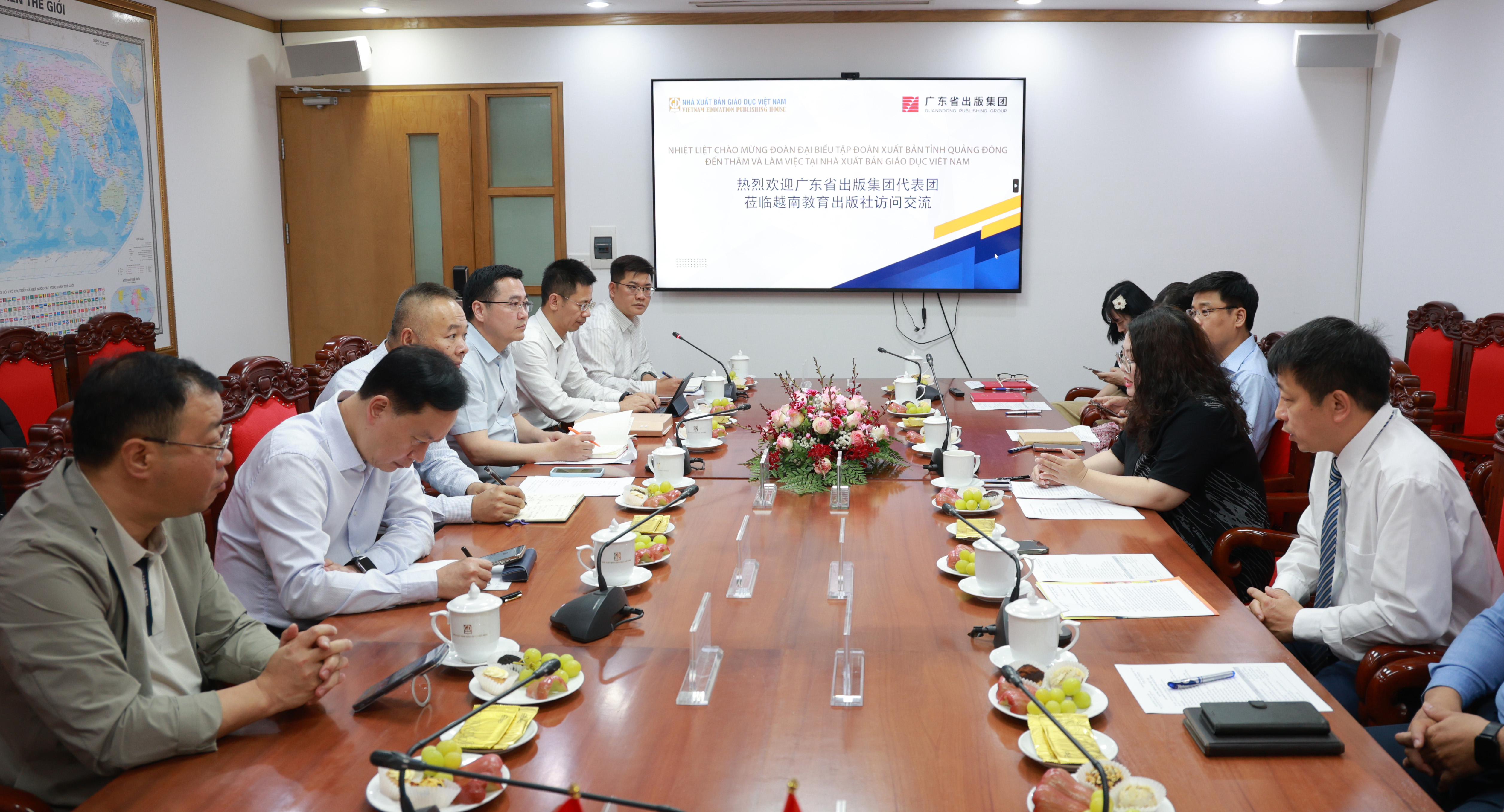 Tham dự buổi làm việc, về phía Tập đoàn Xuất bản tỉnh Quảng Đông có ông Đàm Quân Thiết – Chủ tịch Tập đoàn; ông Tiêu Phong Hoa – Phó Tổng Giám đốc Công ty Truyền thông Nam Phương, cùng lãnh đạo một số nhà xuất bản trực thuộc. Về phía NXBGDVN có ông Phạm Vĩnh Thái – Thành viên HĐTV, Tổng Biên tập; ông Đặng Thanh Hải – Phó Tổng Giám đốc; ông Trần Đức Hùng – Kế toán trưởng, cùng lãnh đạo các ban, đơn vị chức năng.