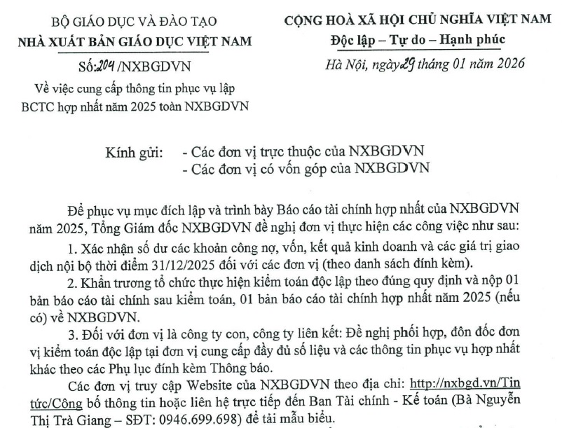 Thông báo về việc cung cấp thông tin phụ vụ lập BCTC hợp nhất năm 2025 toàn NXBGDVN