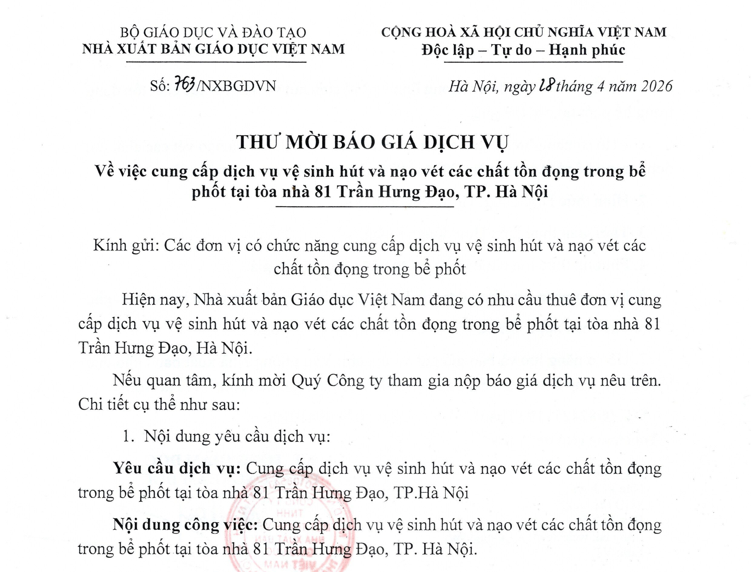 Thư mời báo giá dịch vụ Về việc cung cấp dịch vụ vệ sinh hút và nạo vét các chất tồn đọng trong bể phốt tại tòa nhà 81 Trần Hưng Đạo, TP. Hà Nội