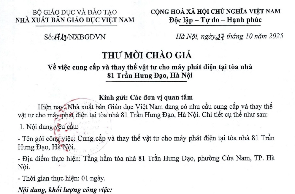 Thư mời chào giá cung cấp và thay thế vật tư cho máy phát điện tại toà nhà 81 Trần Hưng Đạo, Hà Nội