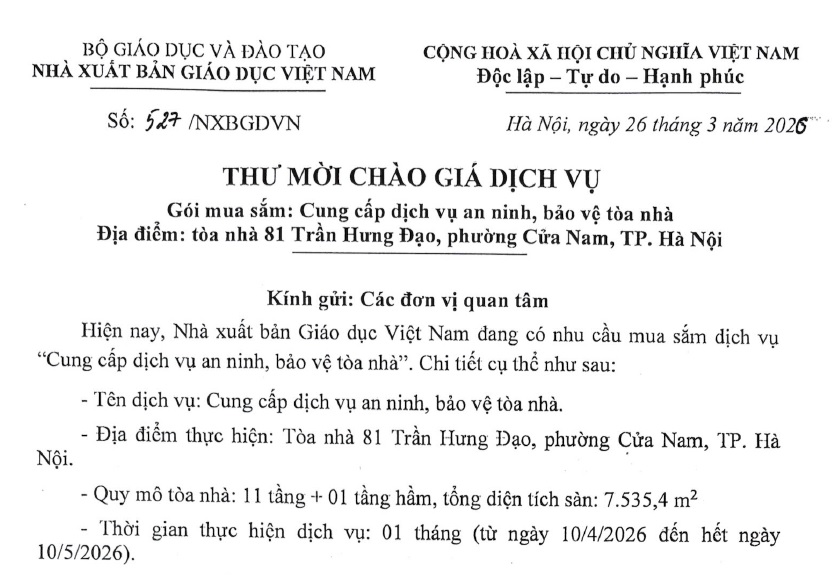 Thư mời chào giá dịch vụ Gói mua sắm: Cung cấp dịch vụ an ninh, bảo vệ toà nhà