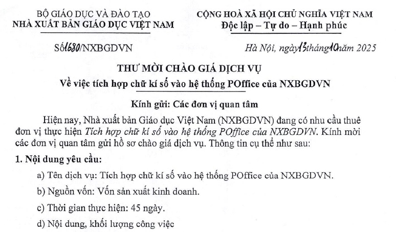 Thư mời chào giá dịch vụ tích hợp chữ kí số vào hệ thống POffice của NXBGDVN